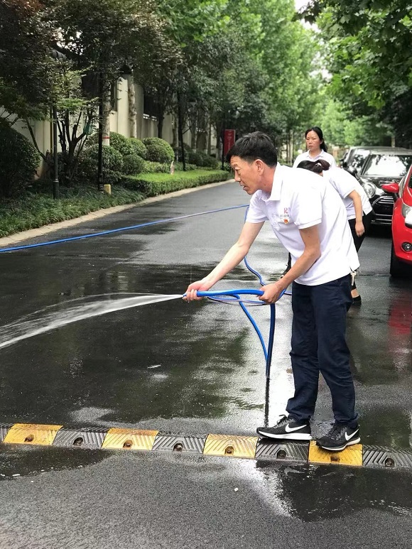 集團(tuán)一組黨員與酒店公司黨員前往物業(yè)公司,在物業(yè)公司保潔主管的分配指揮下,“變身”為保潔員深入物業(yè)公司國(guó)寶花園管理處一線,切身體驗(yàn)物業(yè)基層崗位的工作,大家手執(zhí)草耙掃帚塵推抹布等保潔工具,清理園區(qū)綠化帶及主干道的枯枝落葉和果皮紙屑,沖洗路面塵土,打掃法郡地庫(kù)洗地車無(wú)法進(jìn)入的衛(wèi)生死角,有效協(xié)助管理處在保潔崗位人員緊張的情況下分擔(dān)了部分重點(diǎn)區(qū)域的工作。當(dāng)天室外體感溫度超35度,大家的衣衫一直被汗水浸濕,額頭的汗水更是不停的滑落,但在場(chǎng)的所有黨員同志毫無(wú)怨言,堅(jiān)持工作。
