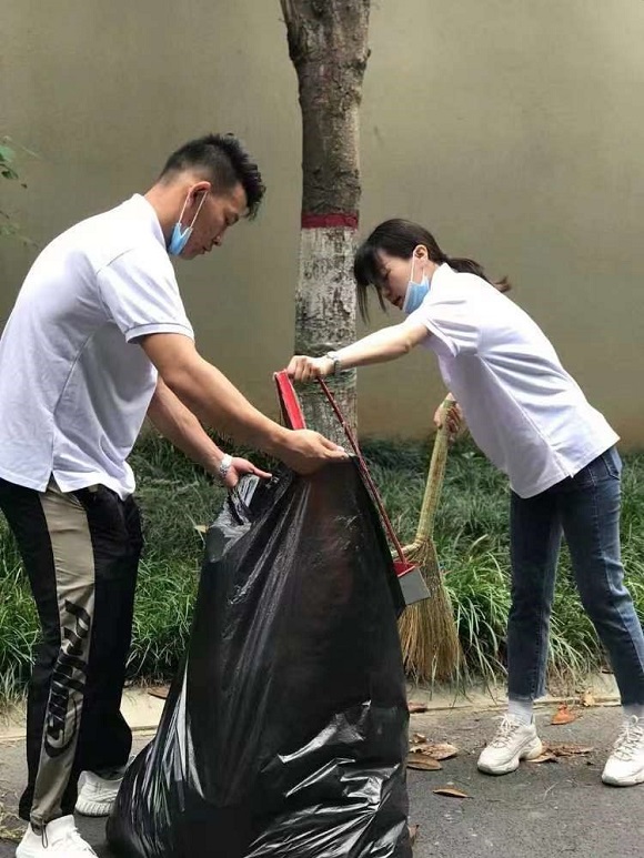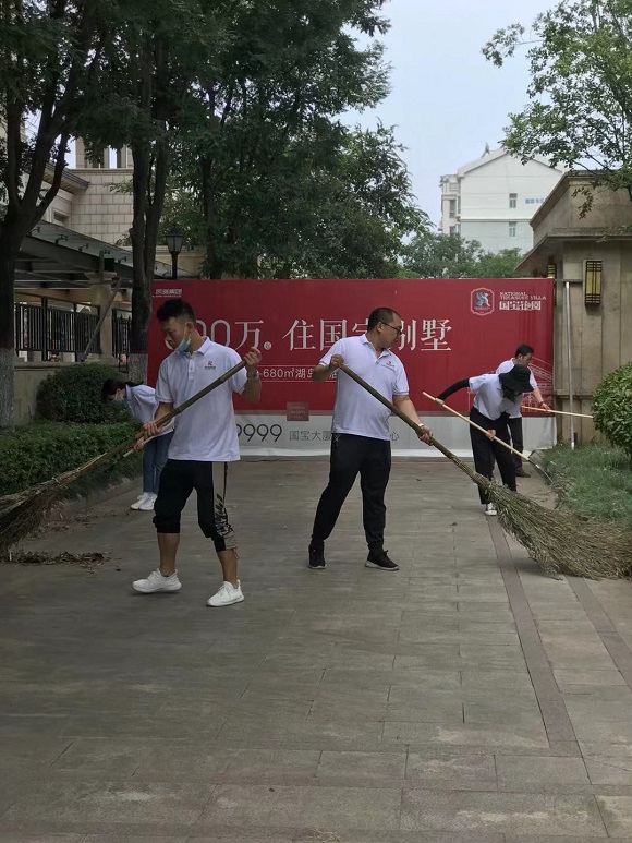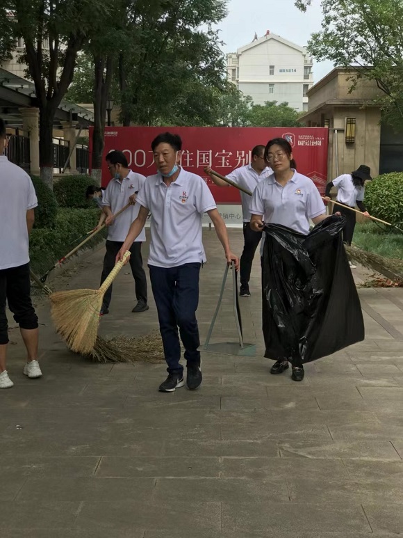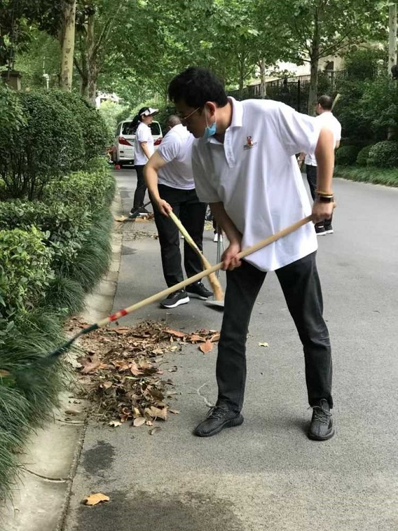 集團(tuán)一組黨員與酒店公司黨員前往物業(yè)公司,在物業(yè)公司保潔主管的分配指揮下,“變身”為保潔員深入物業(yè)公司國(guó)寶花園管理處一線,切身體驗(yàn)物業(yè)基層崗位的工作,大家手執(zhí)草耙掃帚塵推抹布等保潔工具,清理園區(qū)綠化帶及主干道的枯枝落葉和果皮紙屑,沖洗路面塵土,打掃法郡地庫(kù)洗地車無(wú)法進(jìn)入的衛(wèi)生死角,有效協(xié)助管理處在保潔崗位人員緊張的情況下分擔(dān)了部分重點(diǎn)區(qū)域的工作。當(dāng)天室外體感溫度超35度,大家的衣衫一直被汗水浸濕,額頭的汗水更是不停的滑落,但在場(chǎng)的所有黨員同志毫無(wú)怨言,堅(jiān)持工作。